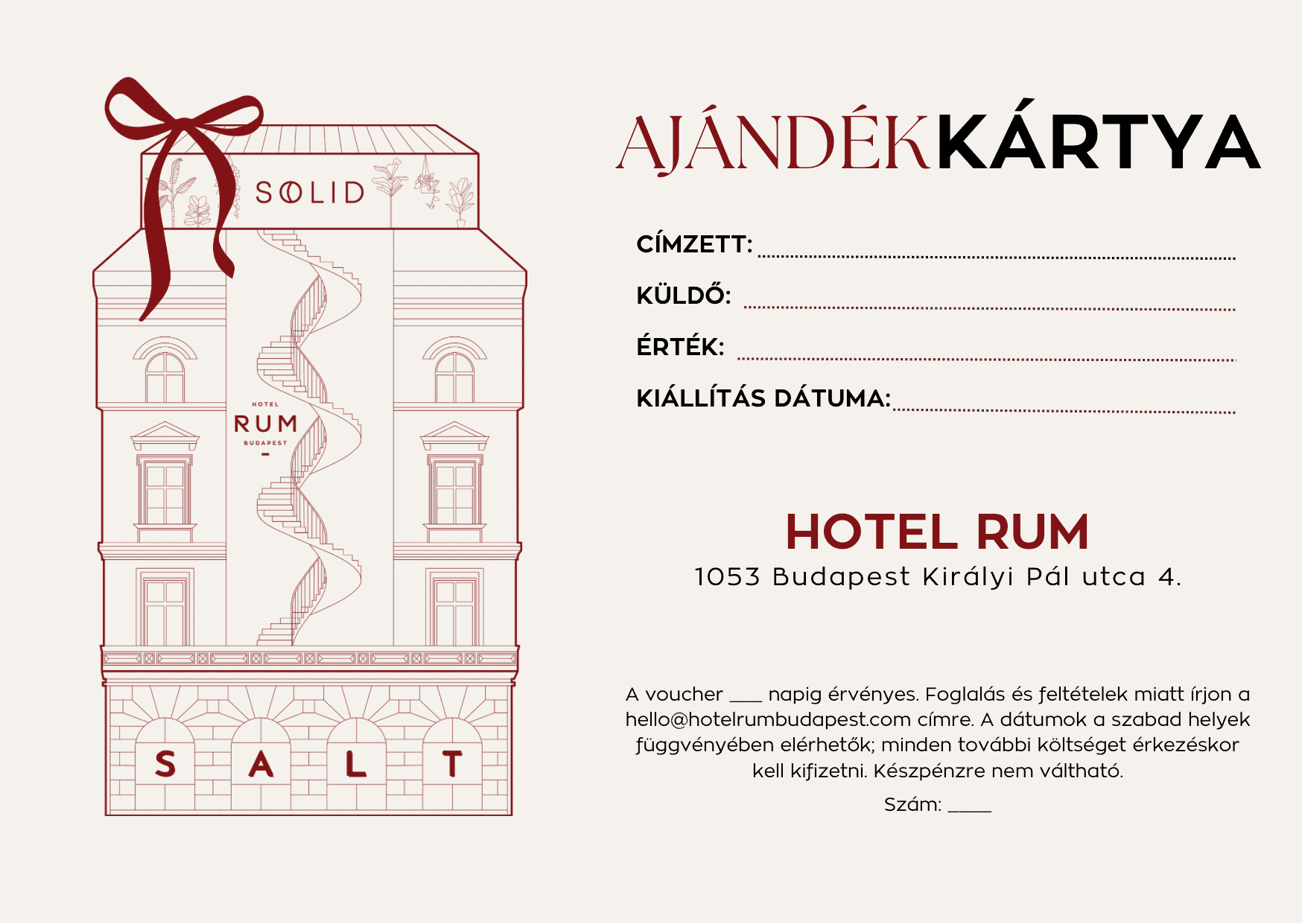 Ajándékozz meghitt és élettel teli budapesti élményt a Hotel RUM Ajándékkártyával! Vásárold meg most és varázsold emlékezetessé szeretteid következő utazását.